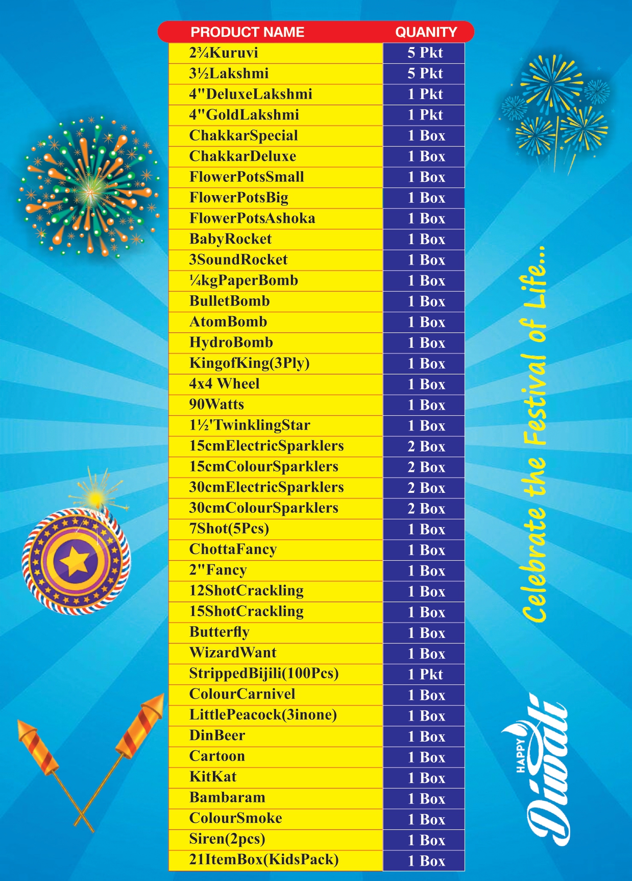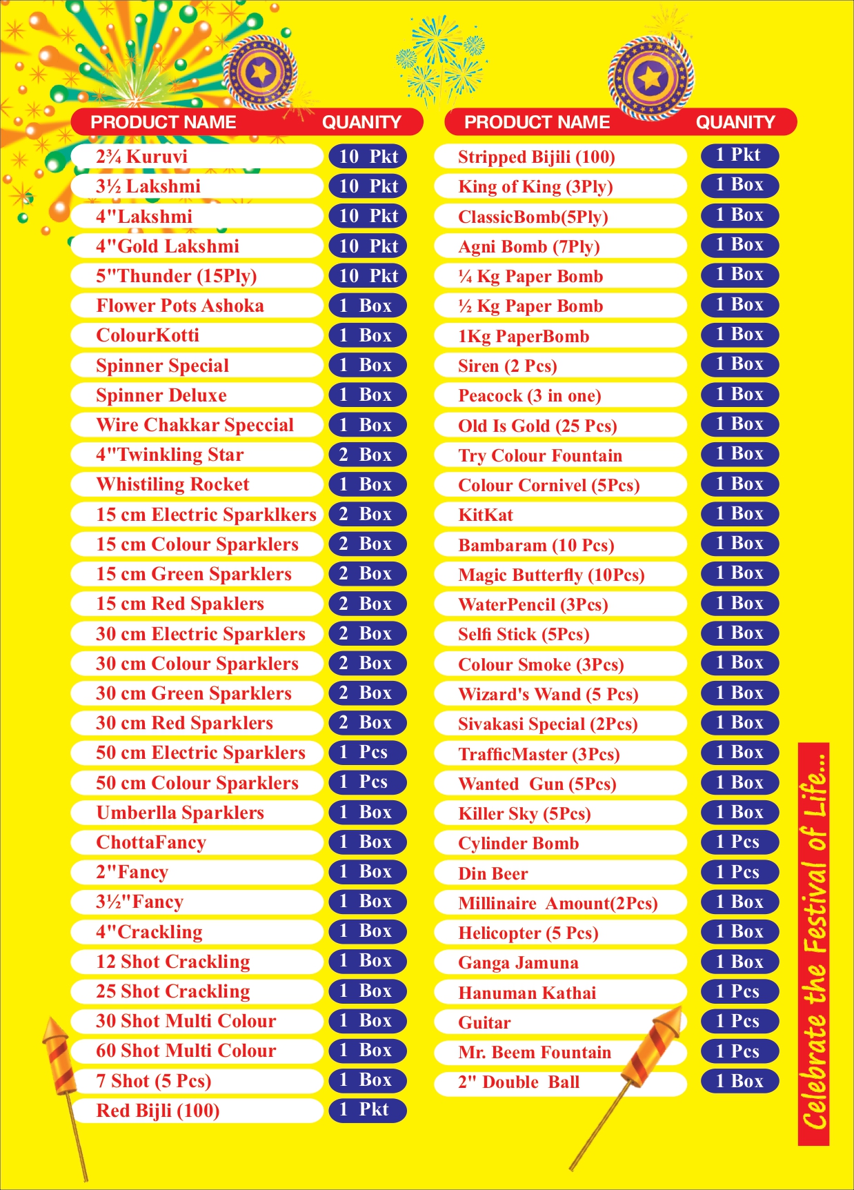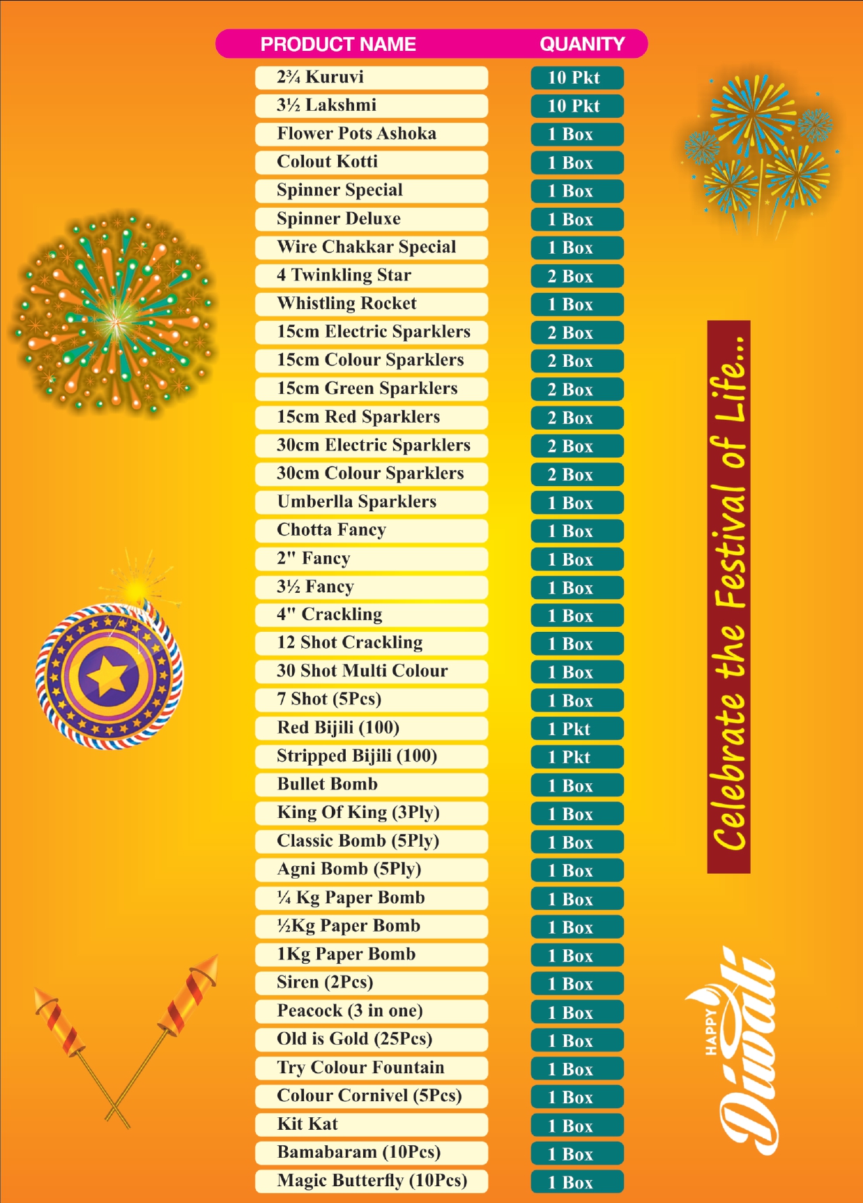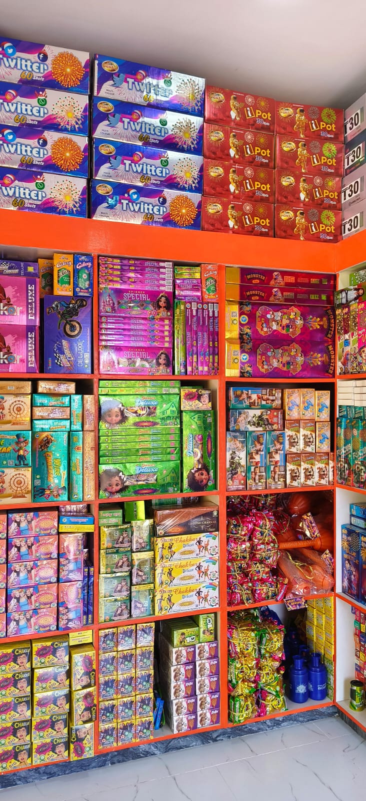 At our Fireworks Showroom we have a wide range of fireworks products such as Sparklers, Ground Chakkars, Flower Pots, Twinkling Stars, Single Sound Crackers, Aerial Shots, Fancy Fireworks, Colour matches and Diwali Fireworks Gift Boxes at competitive price.