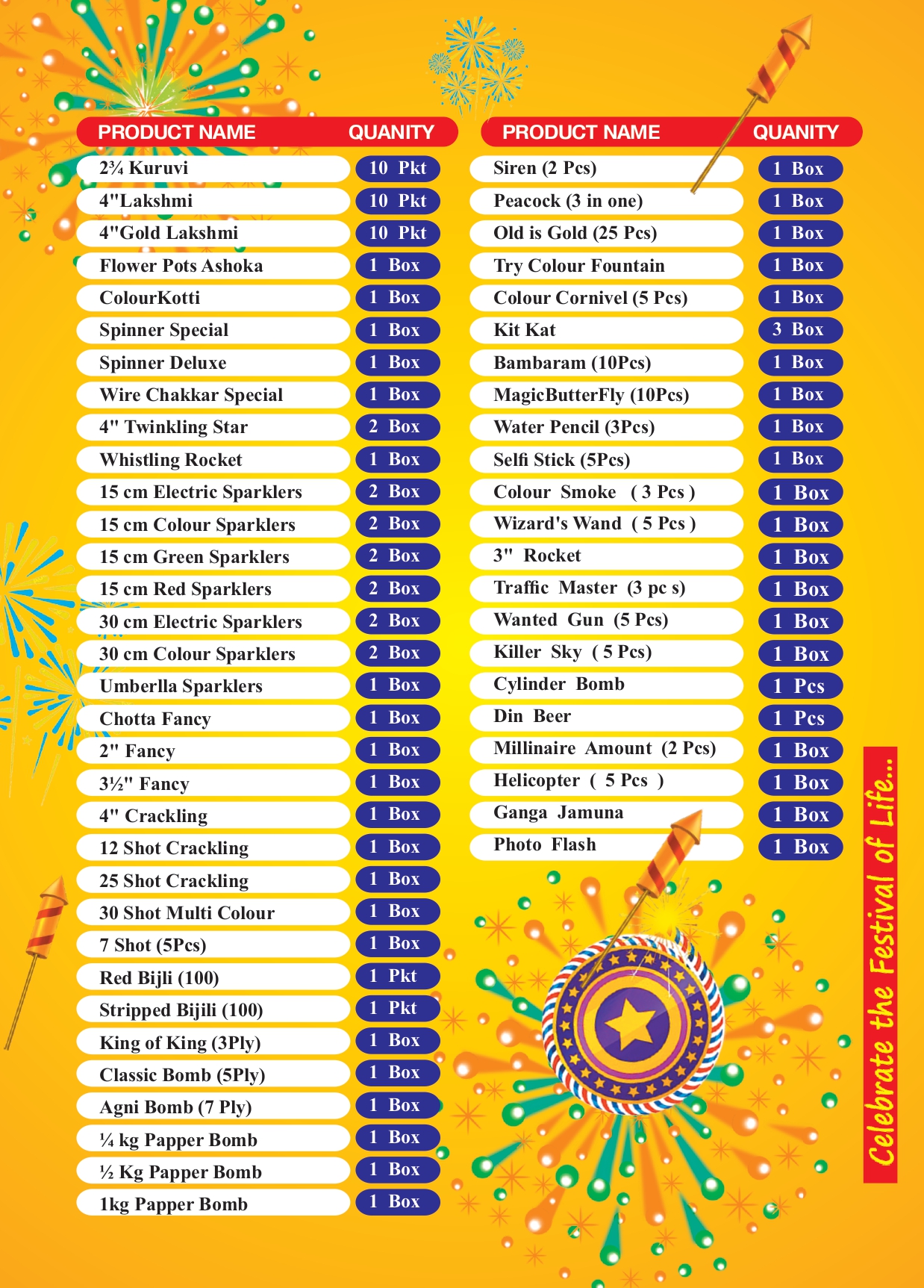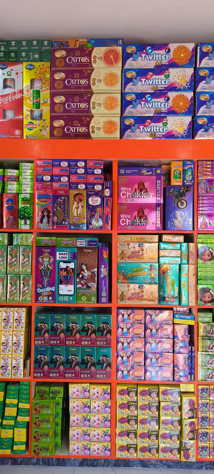 At our Fireworks Showroom we have a wide range of fireworks products such as Sparklers, Ground Chakkars, Flower Pots, Twinkling Stars, Single Sound Crackers, Aerial Shots, Fancy Fireworks, Colour matches and Diwali Fireworks Gift Boxes at competitive price.